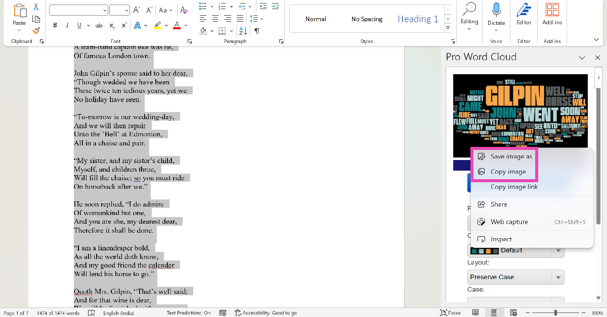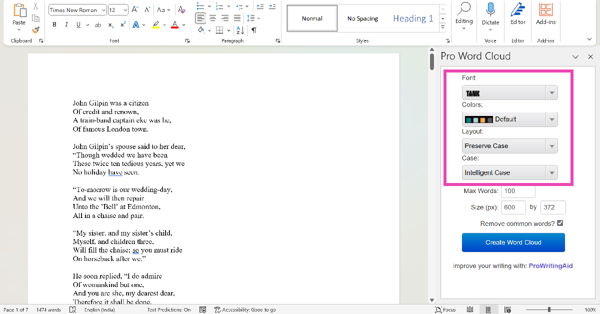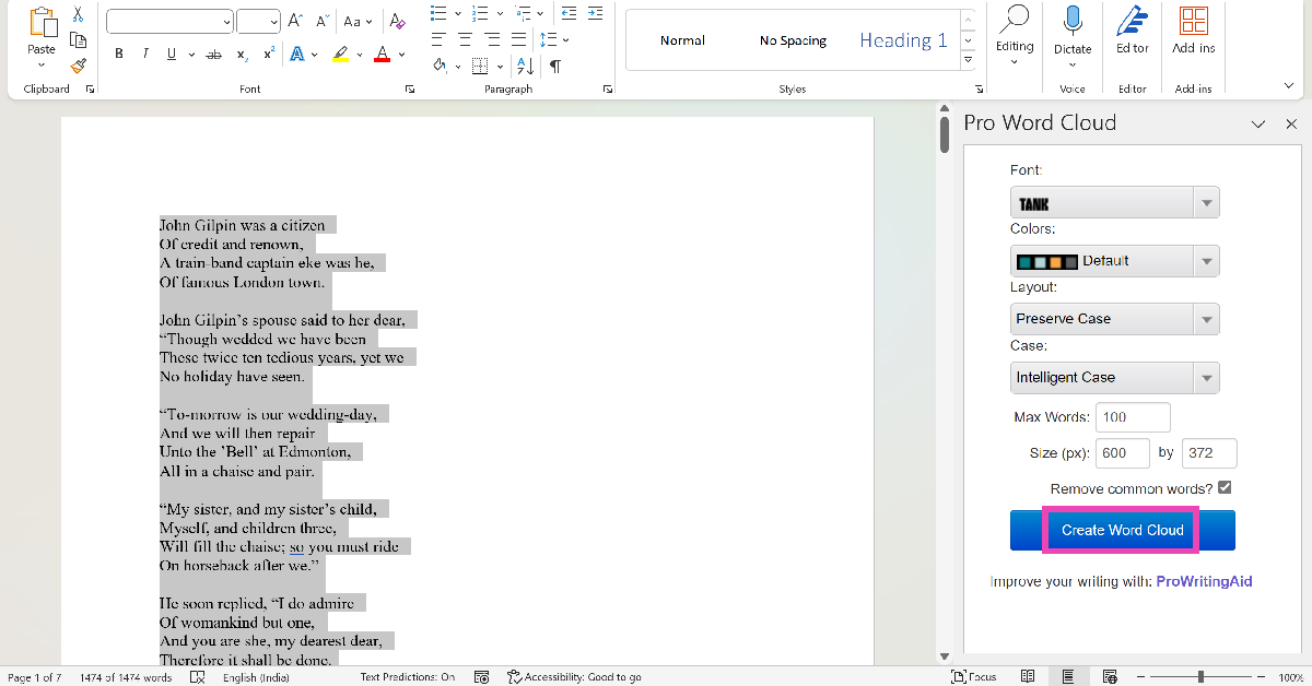 Clique em Add-ins na guia Home e selecione a ferramenta Pro Word Cloud. Destaque o texto no documento e clique em Criar Word Cloud.