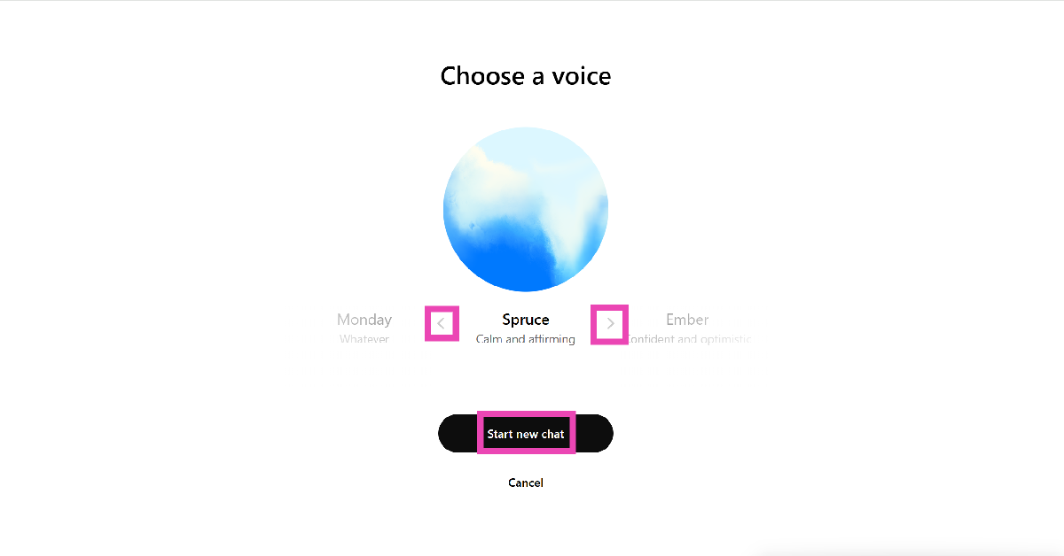 Etapa 4:Use oícones de setapara navegar pelas vozes e clicar emIniciar novo bate-papopara selecionar um.
