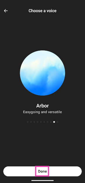Etapa 6: Deslize para a esquerdapara ouvir as diferentes vozes oferecidas e acertarFeitopara selecionar um.