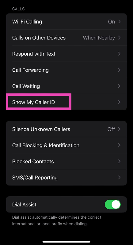 Os usuários do iPhone nos EUA podem ocultar seu identificador de chamadas adicionando *67 antes de discar um número específico. Outros usuários podem ir paraConfigurações>Telefonee desligue a chave seletora paraMostrar meu identificador de chamadaspara obter o mesmo resultado.