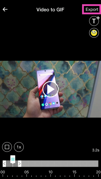 Etapa 4:Use ocontrole deslizantena parte inferior para selecionar o intervalo de tempo do GIF. Você também pode optar por adicionar um texto ou adesivo.