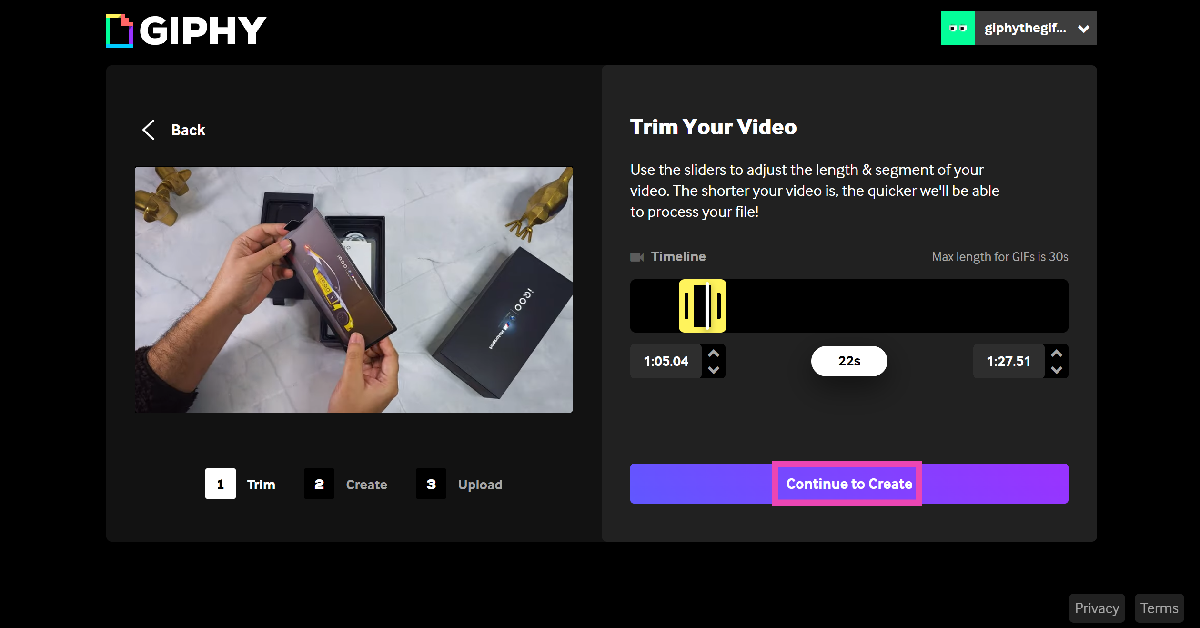 Etapa 4:Ajuste ocomprimentodo GIF. A duração máxima permitida para um GIF é30 segundos. Use ocontrole deslizantepara escolher qual parte do vídeo você deseja transformar em GIF.