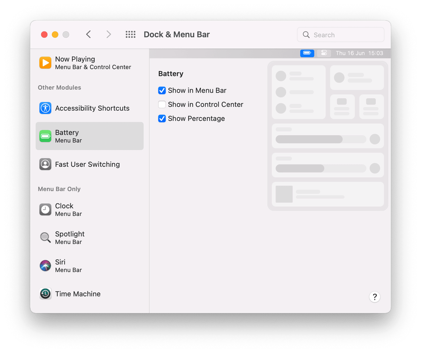 Selecione Bateria no menu do lado esquerdo e ative as opções ‘Mostrar na barra de menu’ e ‘Mostrar porcentagem’.