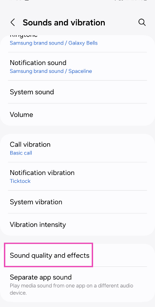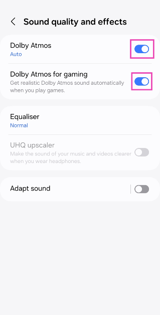 - Vá paraConfigurações> Som e vibração> Efeitos sonorose verifique se há uma opção para ativar o Dolby Atmos