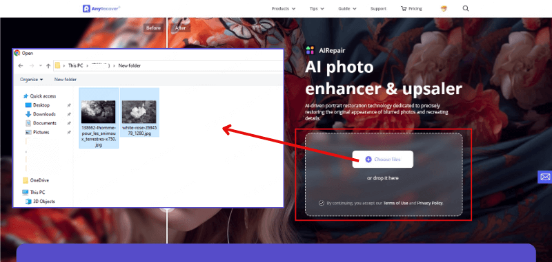 Acesse o site online do AIRepair. Clique em “Escolha arquivos”Para fazer upload das fotos às quais deseja adicionar filtros de maquiagem de Halloween.