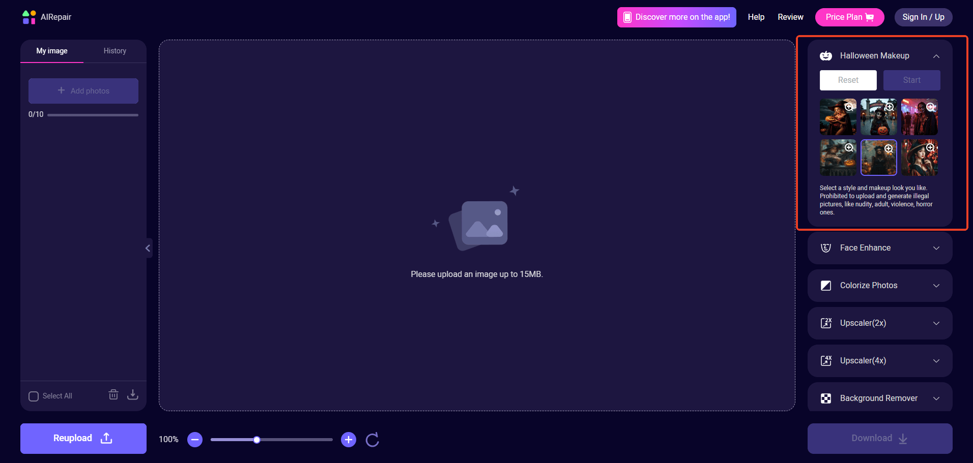 AIRepair é uma ferramenta de aprimoramento de fotos baseada em IA que pode aplicar umMaquiagem de Halloweenfiltre para fotos em segundos. Com a tecnologia de IA integrada, é mais fácil do que nunca criar looks de Halloween. Não perca muito tempo enviando fotos ou escolhendo a maquiagem de Halloween de sua preferência, e você pode salvar seus looks de Halloween em seu dispositivo.