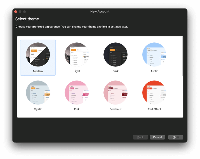 O processo de configuração do eM Client consiste em etapas simples, começando com algumas perguntas fáceis. Primeiro, você será solicitado a selecionar um tema.