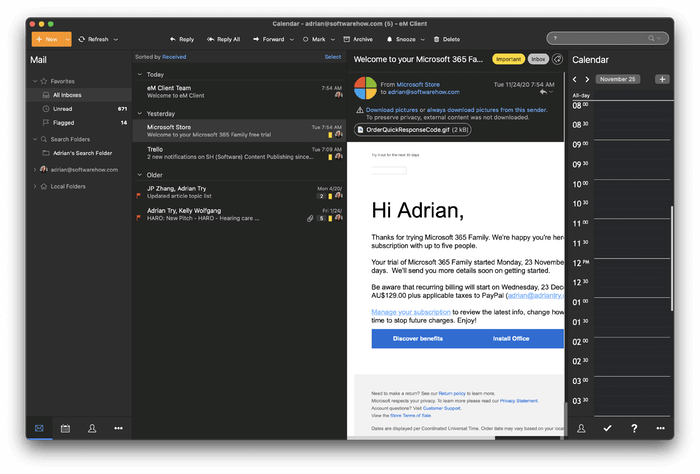eM Clienté um programa moderno e atraente para Mac e Windows com um nome pouco imaginativo. Ele oferece vários recursos que irão acelerar seu fluxo de trabalho e ajudá-lo a organizar seu e-mail. O aplicativo inclui ferramentas de produtividade, como calendário, gerenciador de tarefas e muito mais.