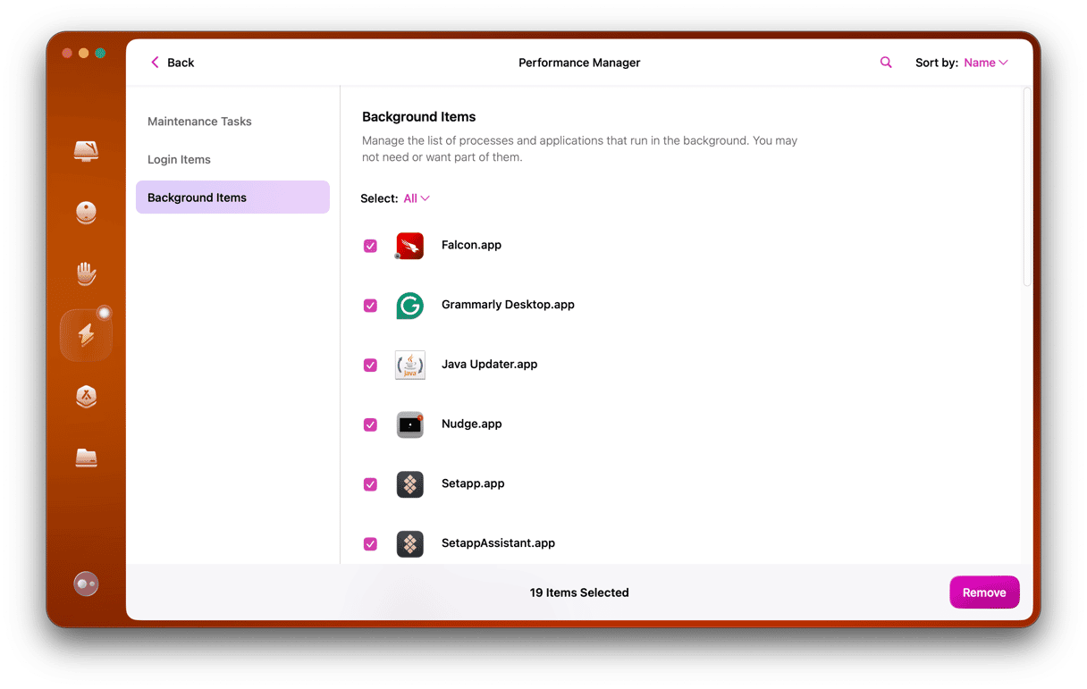 Os agentes de inicialização são menos fáceis de gerenciar porque o macOS não tem como ligá-los e desligá-los. No entanto, você pode desativá-los um de cada vez na ferramenta Desempenho do CleanMyMac: