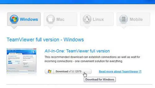 Abra uma janela do navegador da Web e navegue até oPágina de download do Teamviewer. Clique no sistema operacional do seu computador na parte superior da janela e, em seguida, clique no botãoDownloadbotão.