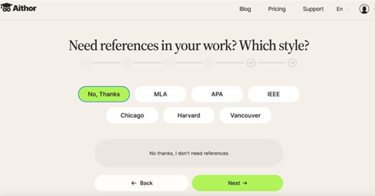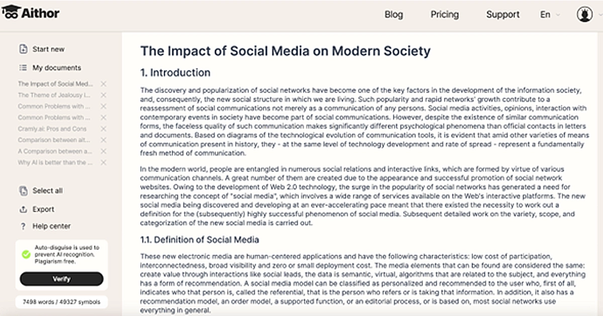 Vamos pegarAithor, redator de IA para projetos acadêmicos e criativos que ajuda a criar conceitos e ideias para conteúdo educacional. Ao contrário de seus concorrentes, o Aithor trabalha com documentos de qualquer tamanho, até dezenas de páginas. Oferece resultados baseados na direção sugerida pelo usuário e é genuinamente indetectável como IA.