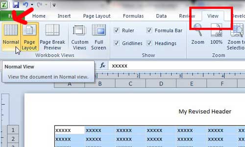 Você pode retornar à visualização normal do Excel clicando no botãoVisualizarna parte superior da janela e clicando no botãoNormalopção noVisualizações da pasta de trabalhoseção da fita.