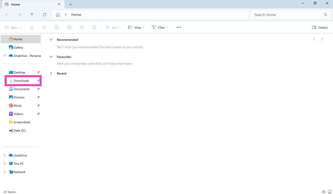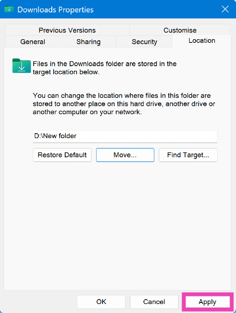 Vá para o Explorador de Arquivos, clique com o botão direito na pasta Downloads na barra lateral e selecione ‘Propriedades’. Vá para a guia Localização, clique em Mover e navegue até a nova pasta para seus downloads. Clique em 'Selecionar pasta'. Clique em “Aplicar” e escolha se deseja que seus downloads atuais sejam transferidos para a nova pasta.