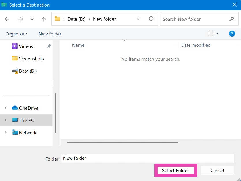 Etapa 4:Navegue até o novopasta de destinopara seus arquivos baixados. Clique emSelecione a pasta.