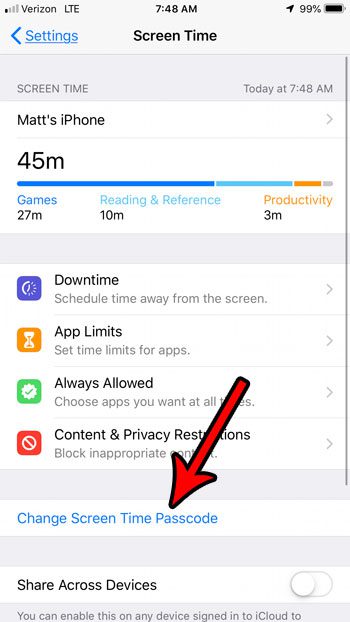 Uma das etapas que você seguiu durante o processo de configuração do recurso Tempo de inatividade envolveu a criação de uma senha. Mas se essa senha for difícil de lembrar ou se você estiver usando o Screen Time no dispositivo do seu filho e ele adivinhar a senha, você pode querer alterá-la para algo novo. Nosso tutorial abaixo mostrará como fazer isso.