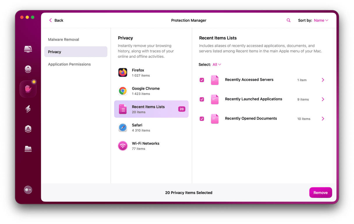 O histórico da área de transferência do seu Mac não é a única parte do sistema que pode comprometer a sua privacidade. A lista de itens recentes no Finder, o histórico do navegador, o histórico de downloads e as pesquisas recentes também podem ser úteis para qualquer pessoa que obteve acesso ao seu Mac e deseja invadir sua privacidade. E não são apenas as pessoas que acessam fisicamente o seu Mac que podem acessar dados privados. Os aplicativos podem fazer isso e coletar ou compartilhar esses dados. É por isso que o macOS não permite que nenhum aplicativo acesse suas pastas Área de Trabalho e Documentos, grave sua tela ou use sua câmera ou microfone sem sua permissão expressa. Mas depois de conceder essa permissão, como você pode revogá-la facilmente? Como você limpa sua lista de itens recentes e se livra de todos os dados privados armazenados pelos navegadores da web em seu Mac? E quanto à lista de redes Wi-Fi que seu Mac armazena? Como você esclarece isso? A solução mais fácil e que recomendamos é usar o módulo Privacidade do CleanMyMac. Ele pode fazer todas essas coisas com rapidez e facilidade. Bastam alguns cliques e pronto. Você pode baixar CleanMyMac gratuitamente aqui e experimentar você mesmo.