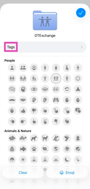 Vá para o aplicativo Arquivos, mantenha pressionada uma pasta e selecione ‘Personalizar pasta e tags’. Para alterar o ícone, selecione um símbolo da lista ou toque em ‘Emoji’ e escolha um. Para alterar a cor, toque em ‘Tags’ e faça uma seleção.