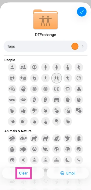 Mantenha a pasta pressionada, toque em ‘Personalizar pasta e tags’, vá em ‘Tags’ e desmarque a cor. Vá para a página anterior e clique em ‘Limpar’ para restaurar o ícone padrão.