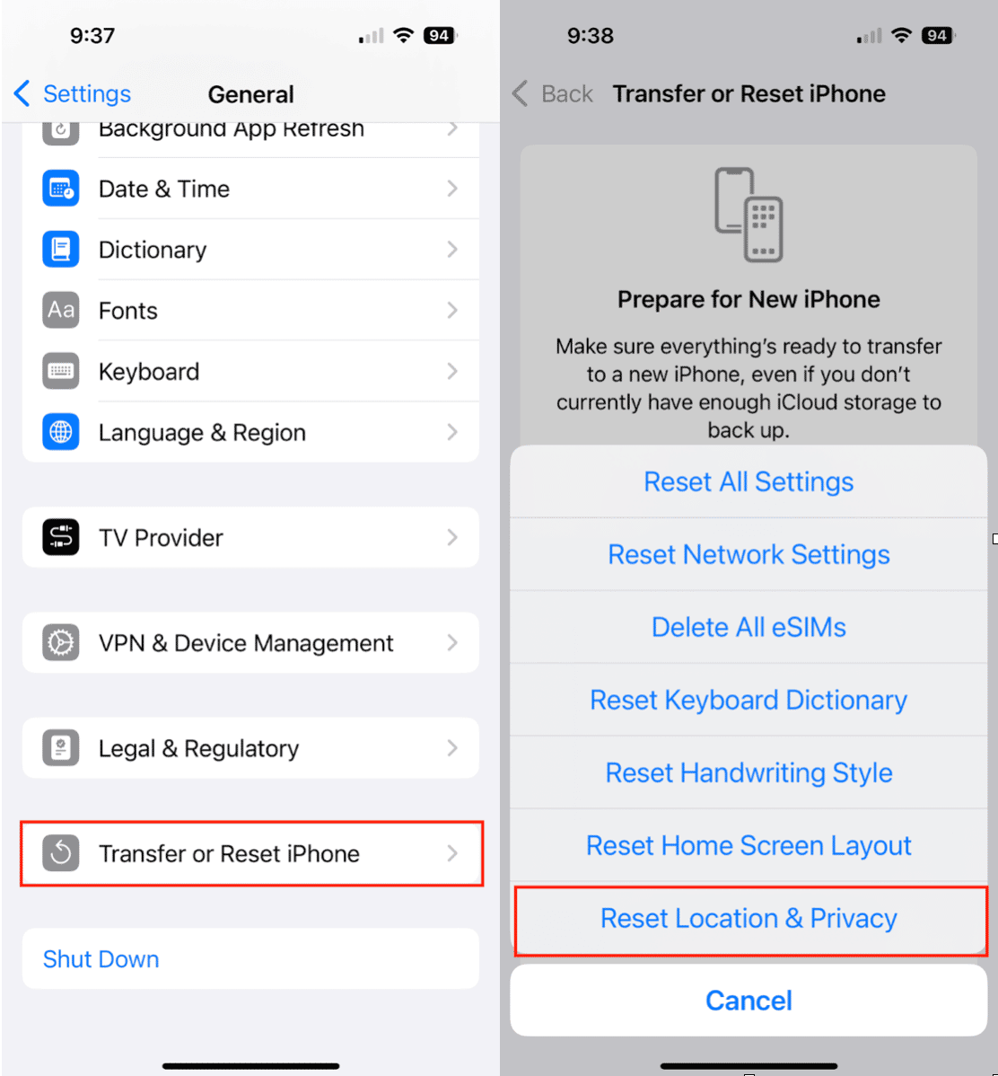 - Escolha Redefinir > Redefinir localização e privacidade.