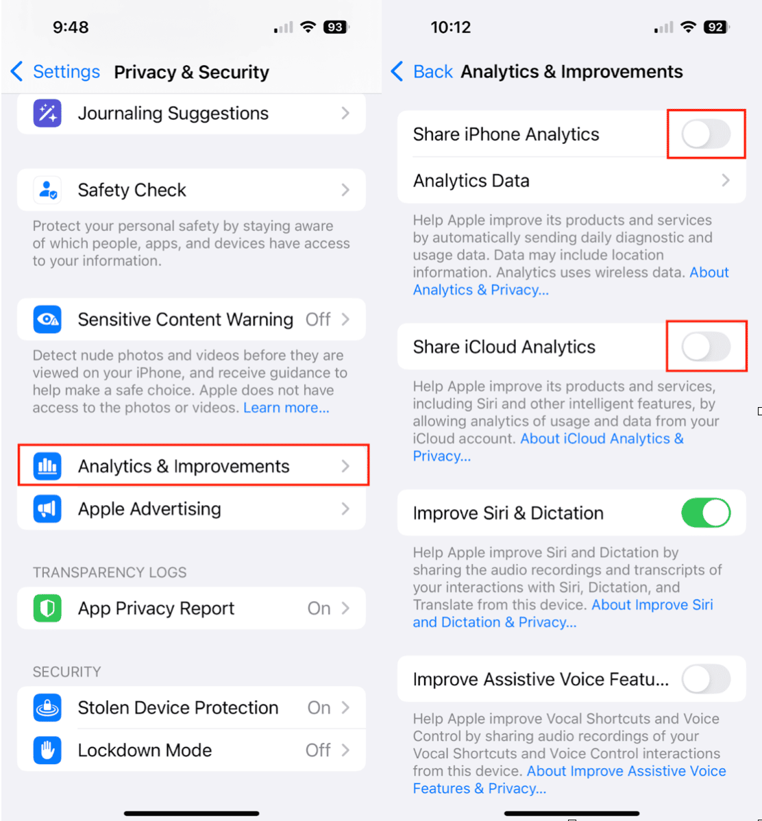 - Desative ‘Compartilhar iPhone Analytics’ e ‘Compartilhar iCloud Analytics’.