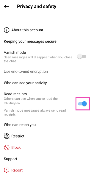 Abra o bate-papo em seus DMs do Instagram, toque no nome na parte superior, selecione ‘Privacidade e segurança’ e desative o botão de alternância para ‘Recibos de leitura’.