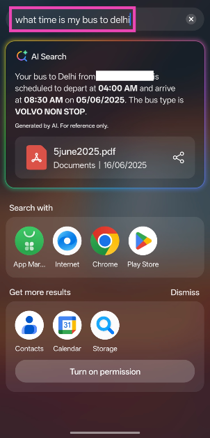 Por exemplo, em vez de procurar uma passagem de ônibus armazenada em seu telefone, você pode simplesmente perguntar a que horas seu ônibus sai. O AI Search procurará o bilhete no armazenamento do seu telefone, processará a data e a hora da partida junto com informações importantes, como o número do seu assento, e retornará com uma resposta em segundos. Se estiver enfrentando algum problema funcional em seu telefone, você pode explicar a situação ao AI Search e ele encontrará a configuração que está causando o problema.