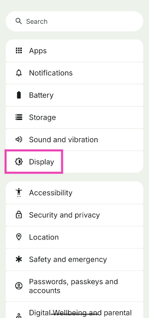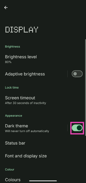 O aplicativo Google Fotos ainda não possui um tema escuro dedicado. Ele segue o tema de cores do seu dispositivo. Para mudar seu dispositivo para o modo escuro, vá paraConfigurações>Exibiçãoe ligue o botão de alternância ao lado de ‘Modo escuro’.