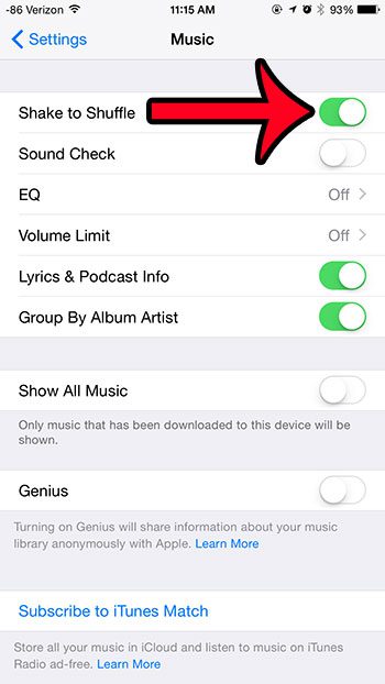 Nosso guia continua abaixo com informações adicionais sobre como ativar o recurso shake to shuffle do iPhone, incluindo fotos dessas etapas.