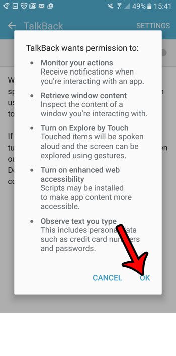 Etapa 6: toque noOKbotão para conceder ao TalkBack as permissões necessárias.