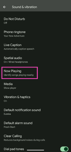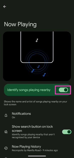 Vá paraConfigurações> Som e vibração> Reproduzindo agorae ative o botão de alternância ao lado de ‘Identificar músicas tocando nas proximidades’.