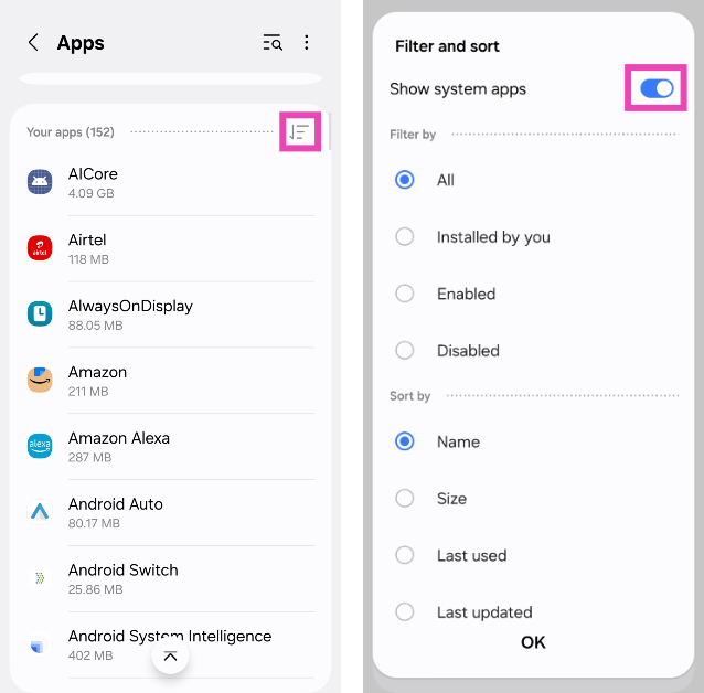 Etapa 2:Acerte oícone de filtroe ligue a chave seletora ao lado deMostrar aplicativos do sistema.