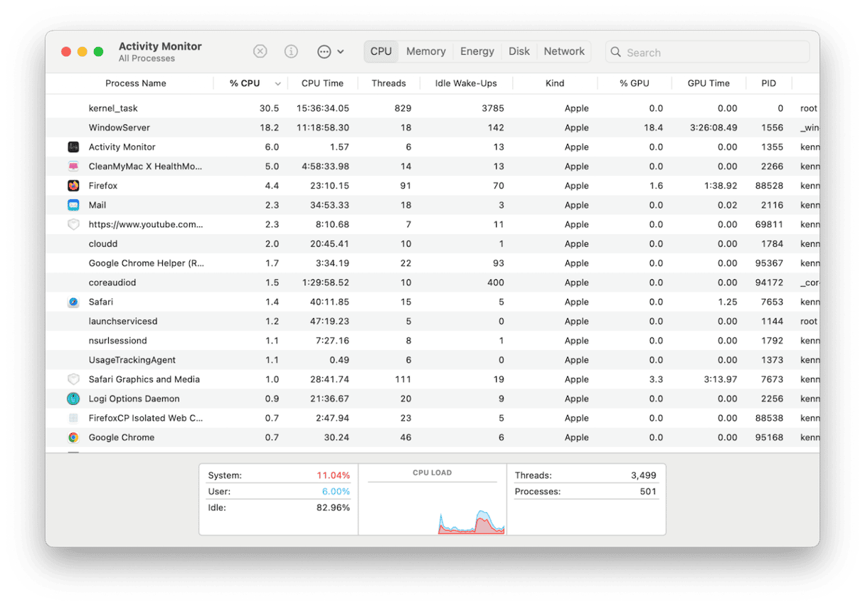 - Você verá os processos listados na ordem dos ciclos de CPU que estão usando. Normalmente, a lista começa com os consumidores mais altos e a seta ao lado da CPU no topo da coluna aponta para baixo. Se não for esse o caso, clique no cabeçalho da coluna para ver os maiores consumidores no topo.