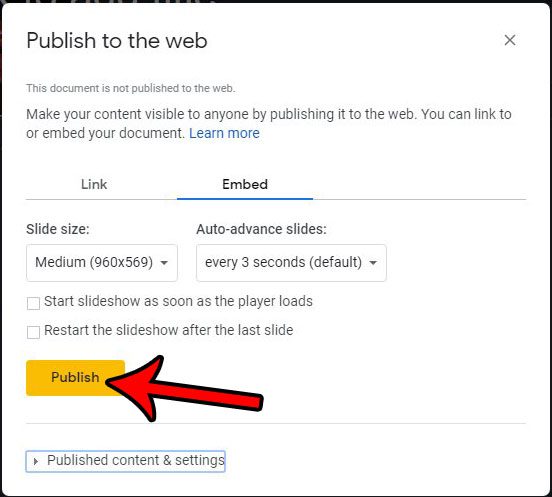 Passo 6: Clique no botão OK para confirmar que deseja publicar a apresentação de slides.