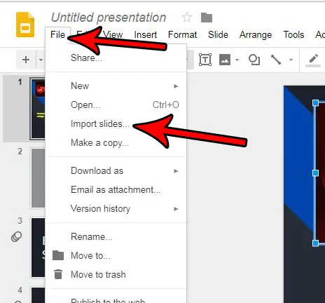 Passo 2: Clique noArquivoguia na parte superior da janela e selecione oImportar slidesopção.