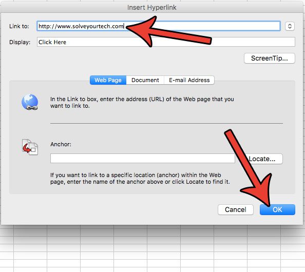 Passo 5: Clique dentro doLink paracampo e digite o URL da página da Web que você deseja que os visitantes da planilha visitem quando clicarem no link. Clique noOKbotão na parte inferior da janela quando terminar.