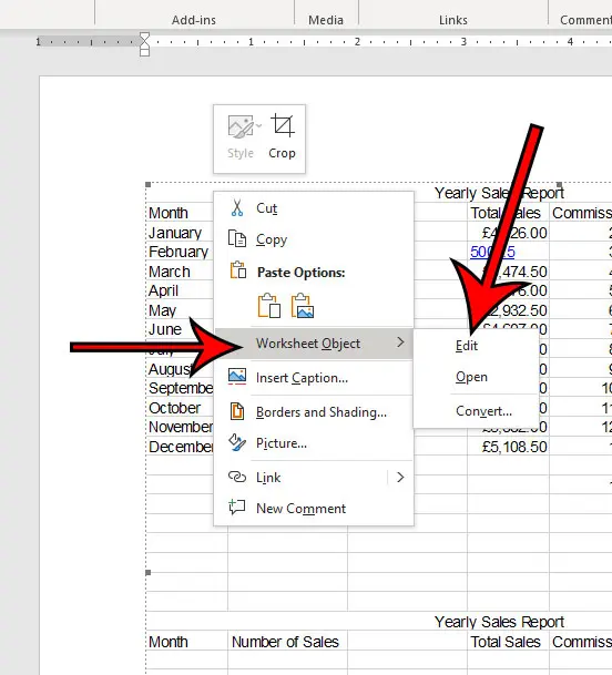 Se você deseja fazer alterações nos dados no arquivo do Excel, clique com o botão direito do mouse no objeto Excel no documento, escolhaObjeto de planilha, então cliqueEditar.