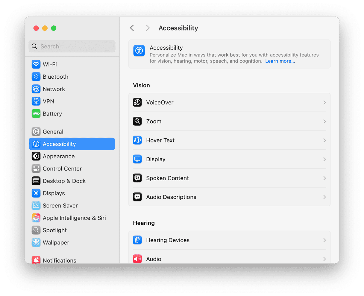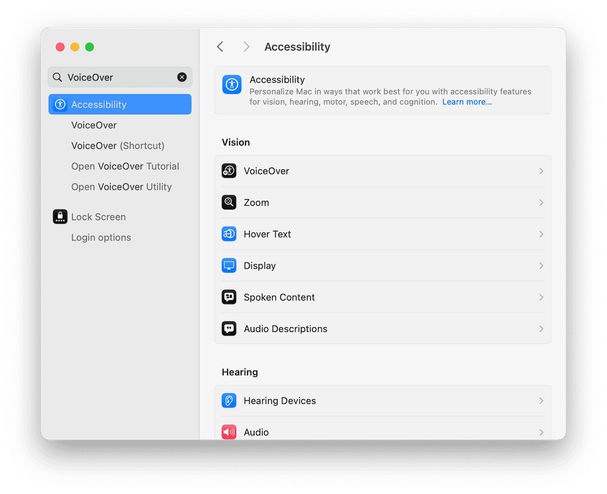 Dica:Você também pode usar a barra de pesquisa na parte superior das Configurações do sistema. Digitar Zoom ou VoiceOver leva você direto para o painel relevante. Economiza tempo.