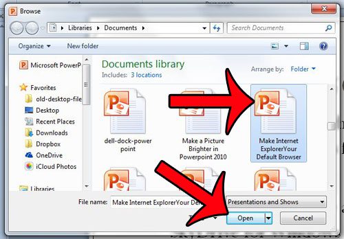 Etapa 7: selecione oPower Pointarquivo que deseja mesclar com o arquivo atual e clique no botãoAbrirbotão.