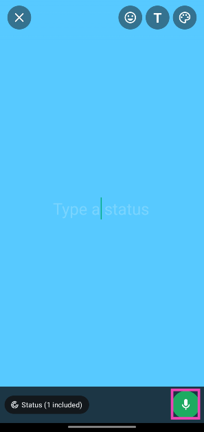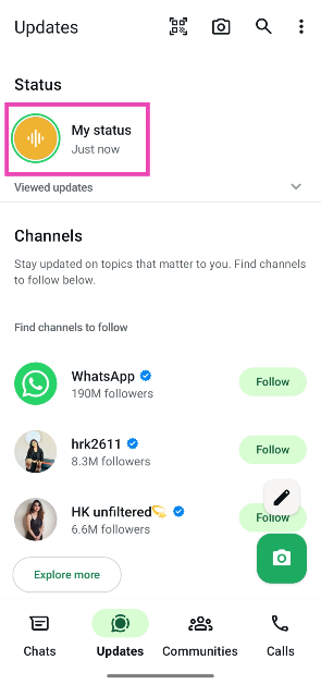 Vá paraWhatsApp>Atualizações, toque no ícone de lápis e mantenha pressionado o ícone do microfone para gravar uma nota de voz. Solte o ícone para encerrar a nota de voz e pressione a tecla ‘Enviar’ para publicá-la como seu status.