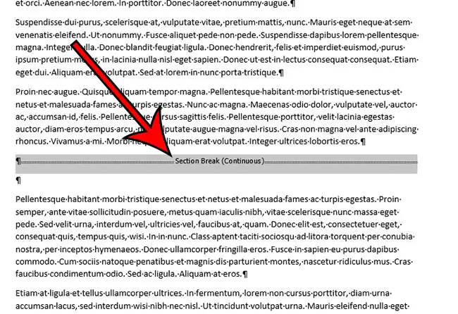 Passo 4: Localize uma quebra de seção em seu documento, clique com o mouse no lado esquerdo da quebra, mantenha-o pressionado e arraste para a extremidade direita da quebra para selecionar tudo.