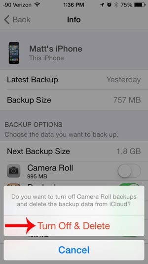 Observe que isso não excluirá o rolo da câmera do iPhone. Ele simplesmente interromperá o backup do rolo da câmera no iCloud.