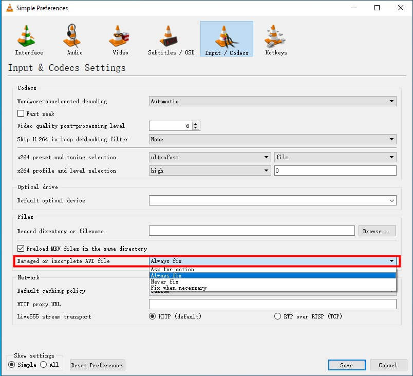 Etapa 5.Sob o “Entrada / Codecs”, localize e selecione a guia “Arquivo AVI danificado ou incompleto”Opção.