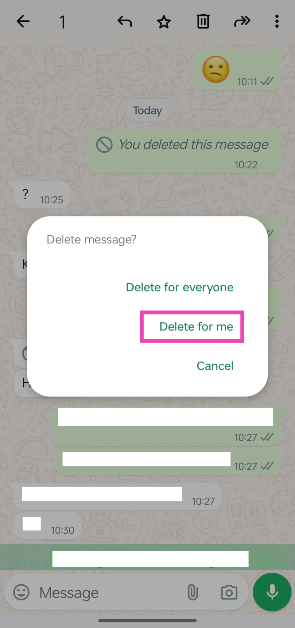 Etapa 3:Toque emExcluir para mim. Se você selecionarExcluir para todos, você não poderá desfazer a ação.