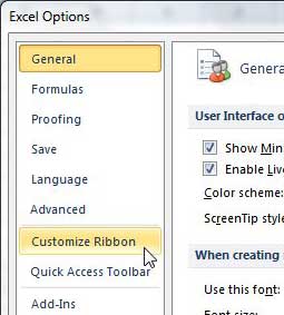 Etapa 3: cliquePersonalizar faixa de opçõesna lista de guias no lado esquerdo doOpções do Exceljanela.
