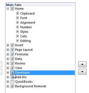 A guia Excel Developer ficará visível em seu aplicativo quando houver uma marca na caixa de seleção Desenvolvedor. O mesmo vale para qualquer uma das outras caixas aqui que indicam guias adicionais na faixa do Excel.
