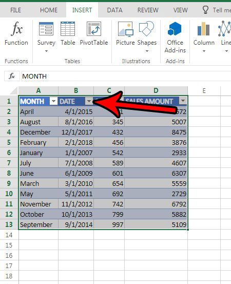 Etapa 3: selecione todos os seus dados. Observe que se você ainda não possui cabeçalhos para seus dados, deverá adicioná-los para tornar esse processo um pouco mais fácil. Por cabeçalhos quero dizer a primeira linha acima dos dados que identifica o tipo de dados em suas células.