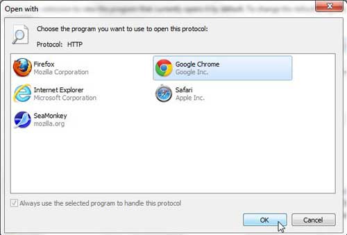 Clique no navegador da Web que deseja usar ao clicar em um link e, em seguida, clique no botãoOKbotão.