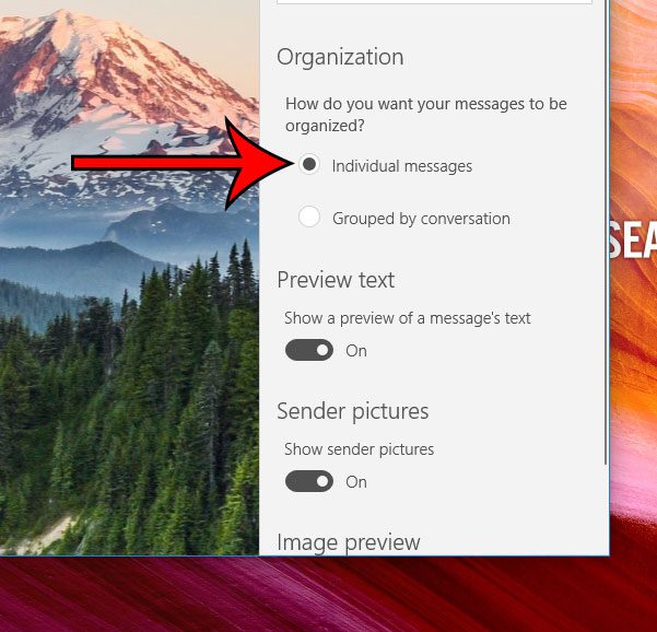 Nosso guia continua abaixo com informações adicionais sobre como desativar a visualização de conversas no Windows 10 Mail, incluindo imagens dessas etapas.