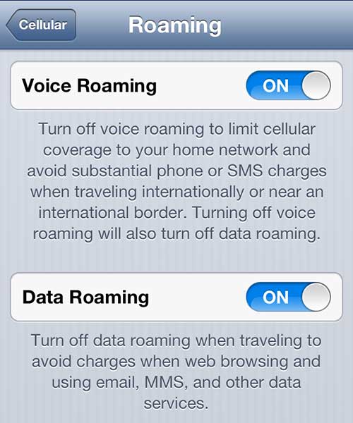 Felizmente, por padrão, seu iPhone está configurado para que você não use dados enquanto estiver em roaming.