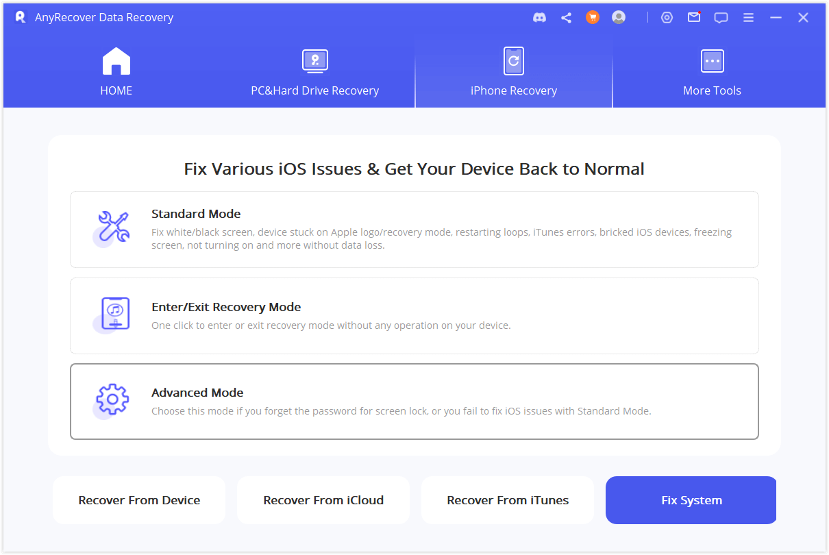 Etapa 2:Conecte seu iPhone ao computador com um cabo USB. Clique em “Consertar sistema” e selecione “Modo Avançado”.